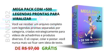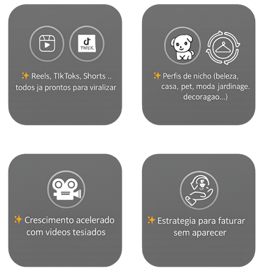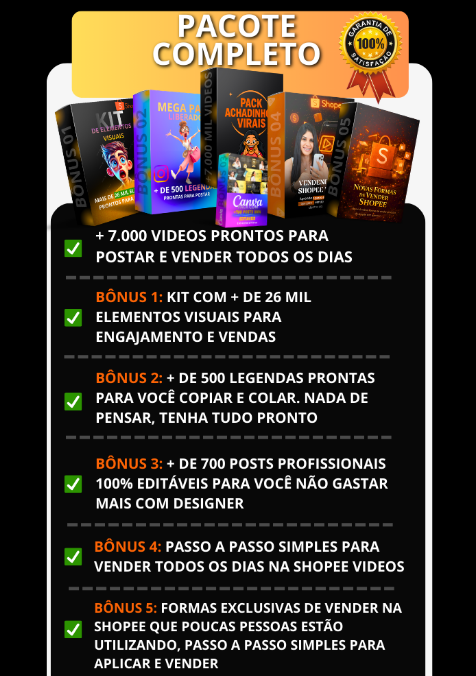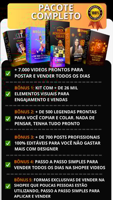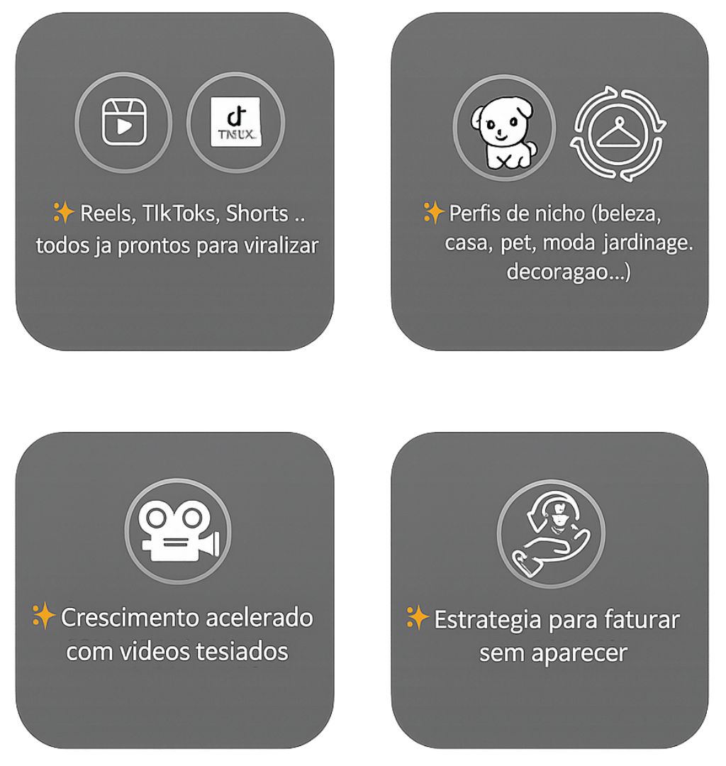 Você recebe acesso total ao Pack com +4.000 vídeos virais, organizados por categoria, prontos para baixar, postar e vender todos os dias, sem precisar aparecer e sem editar nada.